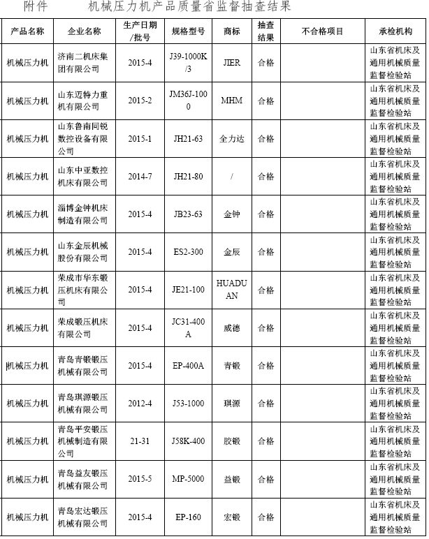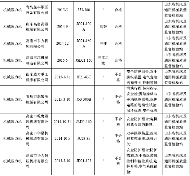 山東省質(zhì)監(jiān)局檢測(cè)出5家5批次機(jī)械壓力機(jī)不合格